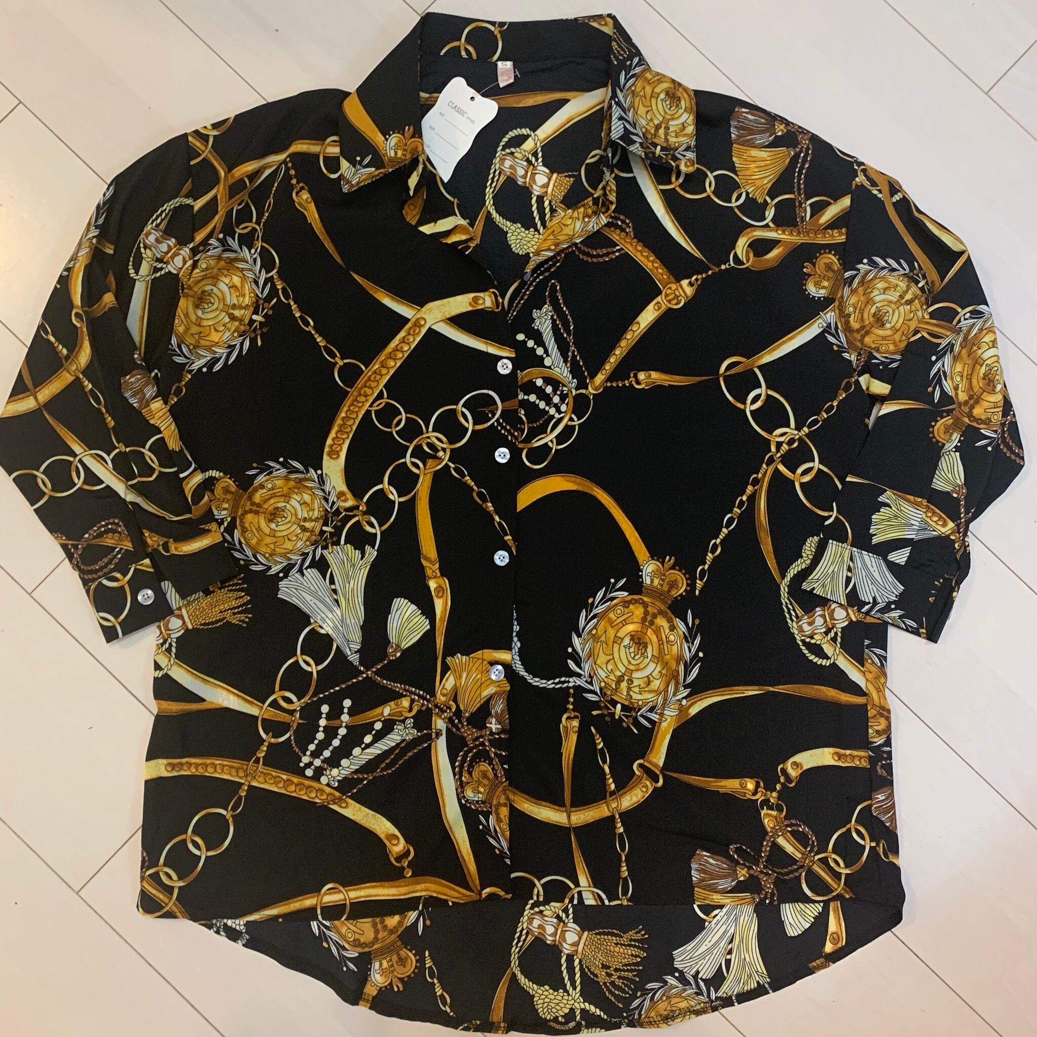 【送料無料】【即日・翌日発送】チェーン柄シャツ★ホワイト×ゴールド オーバーサイズシャツ チェーン柄 リボン柄