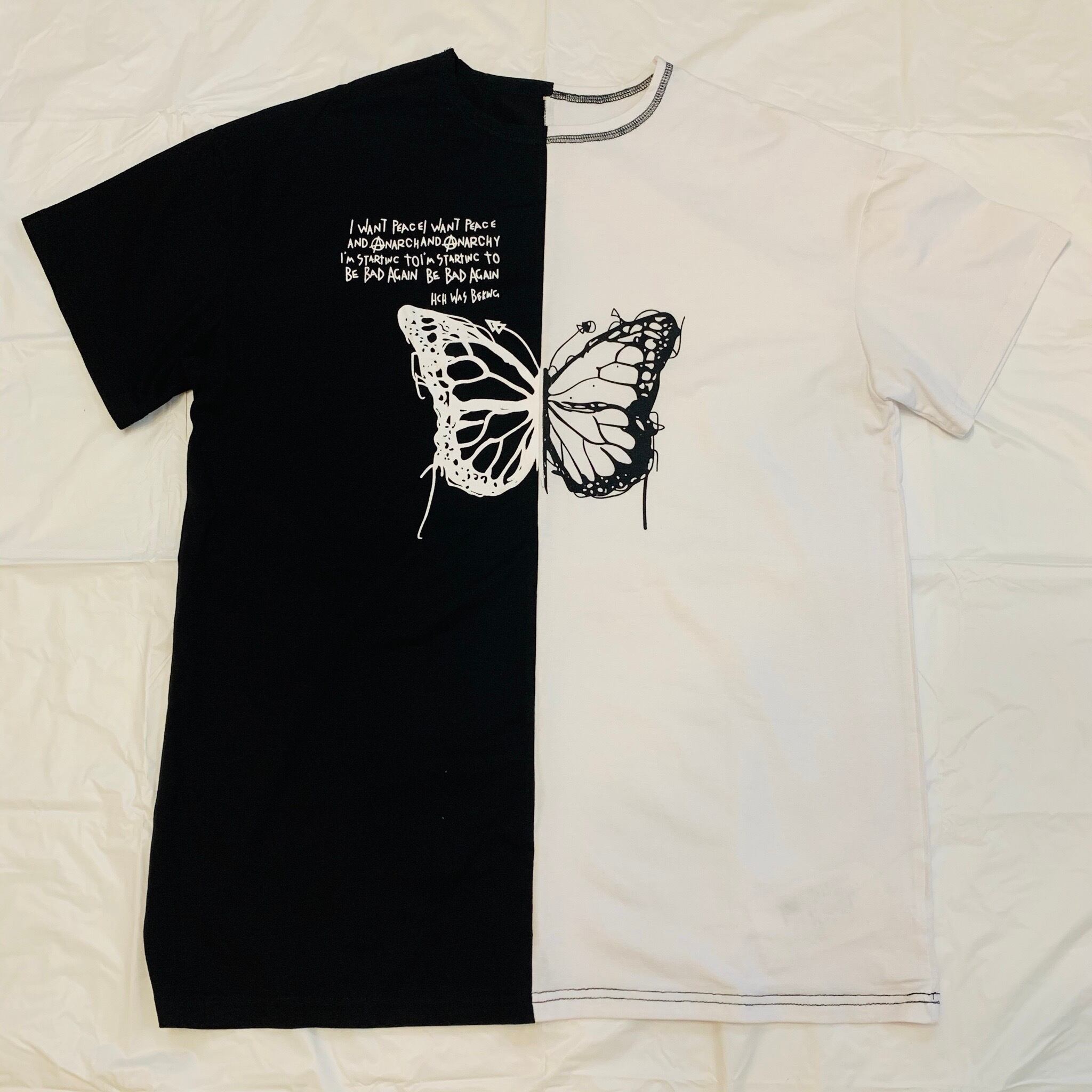 【送料無料】【即日・翌日発送】流行りのオーバーサイズ✖︎バイカラー✖︎バタフライ☆°+.首元のステッチがお洒落♪Tシャツ 蝶 ホワイト ブラック